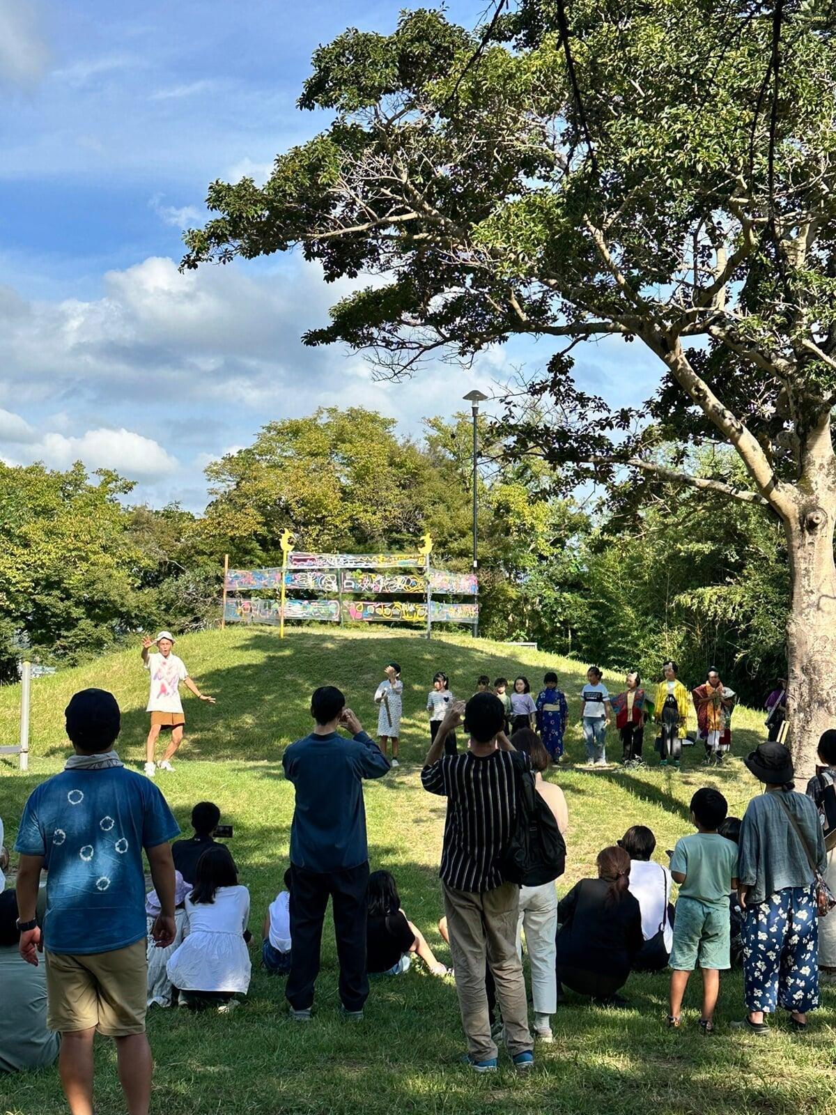 静岡県舞台芸術センター(SPAC)の俳優山崎皓司さん、森山冬子さと自然の達人鈴木よしおさんによる演劇ワークショッププロジェクト。会場は掛川市の掛川古城があったとされる龍華院子角山公園、通称ねずみ山。過去・現在・未来をテーマに、山崎皓司さんが描く演劇像に子どもたちが飛び込み、創り出しました。